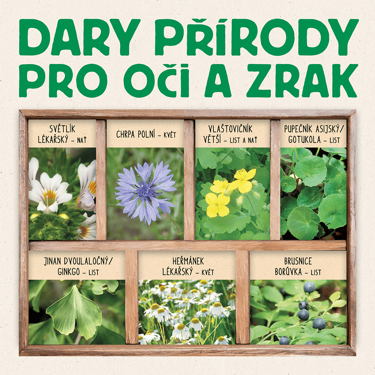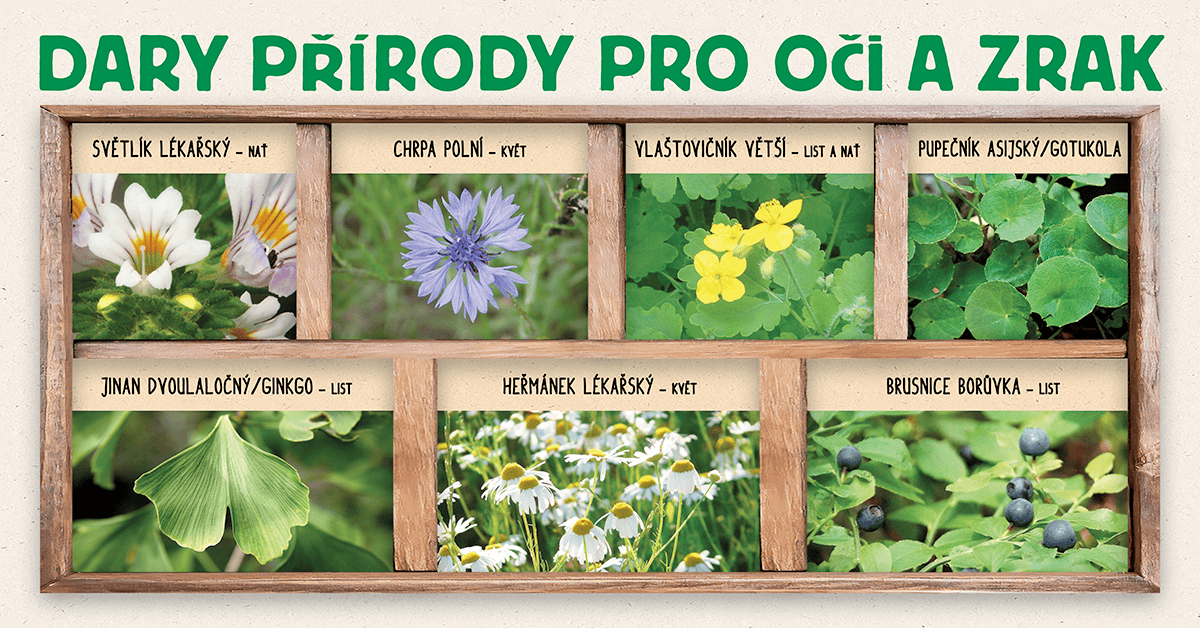 LÁSKA B35:Brusnice borůvka – list (Vaccinium myrtillus), pupečník asijský/gotukola – list (Centella asiatica), vlaštovičník větší – list a nať (Chelidonium majus), heřmánek lékařský – květ (Matricaria chamomilla), chrpa polní – květ (Centaurea cyanus), světlík lékařský – nať (Euphrasia rostkoviana), jinan dvoulaločný/ginkgo – list (Ginkgo biloba).